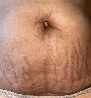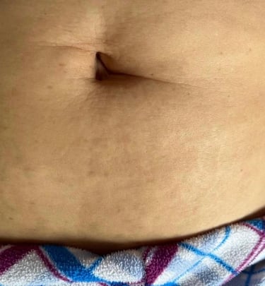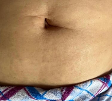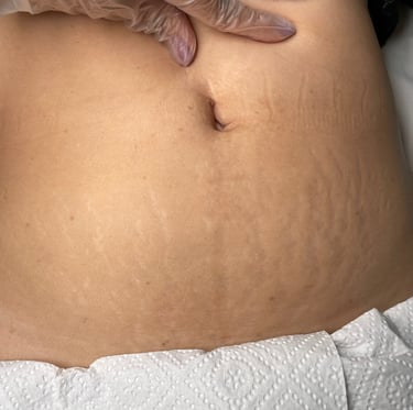 Imagen tomada poco después de 1 mes del procedimiento, la textura de la piel hundida ha mejorado en uh 70% después de la 1era sesión, así como la coloración de la estría.