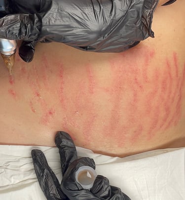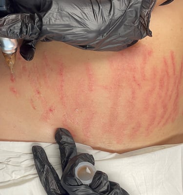Imagen tomada 3 semanas después del procedimiento, depende del proceso de cicatrización de cada persona pueden llegar a marcarse más las estrías durante la 3era semana, sin embargo desaparece a los poco días.